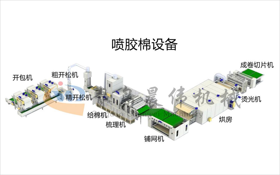 開(kāi)包機(jī)-開(kāi)松機(jī)-振動(dòng)給棉機(jī)-梳理機(jī)-鋪網(wǎng)機(jī)-烘房-燙光機(jī)-成卷切片機(jī)