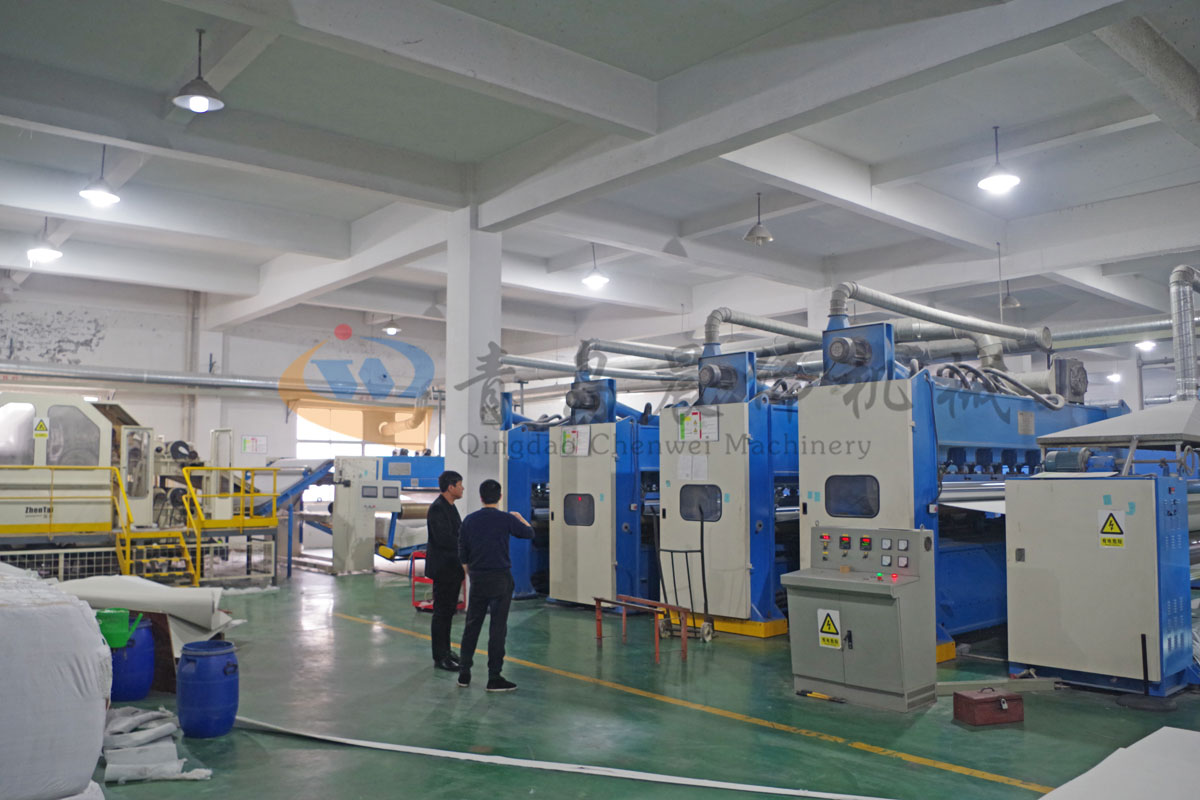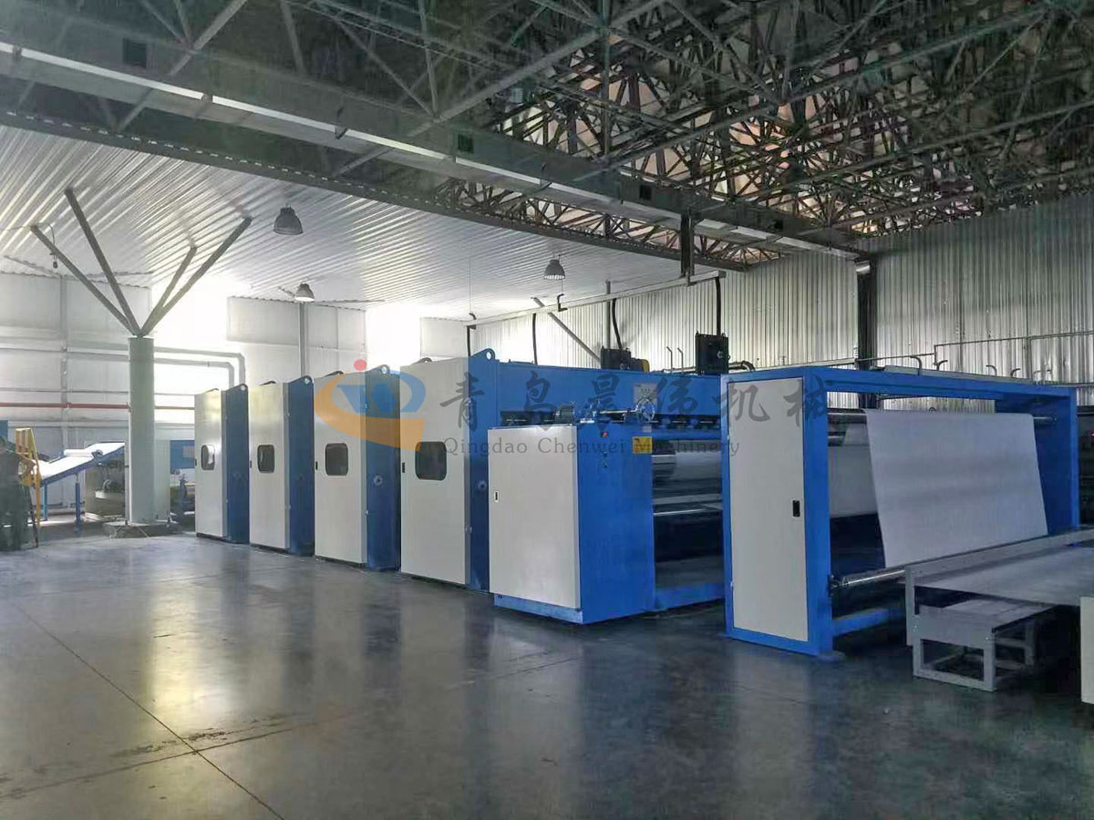 開包機(jī)-開松機(jī)-振動(dòng)給棉機(jī)-梳理機(jī)-鋪網(wǎng)機(jī)-針刺機(jī)-切邊成卷機(jī)